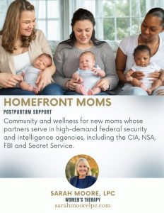 Join our DMV support group, “Homefront Moms” for new moms whose partners serve in high-demand federal security and intelligence agencies, including Secret Service, CIA, NSA and FBI. Build community, vent, laugh and share with women who get it. Follow the “Path to Wellness” from PSVa. Meet the 1st & 3rd Tuesday evenings of the month from 6-7:30pm, mostly online. Lead by Sarah Moore, LPC.