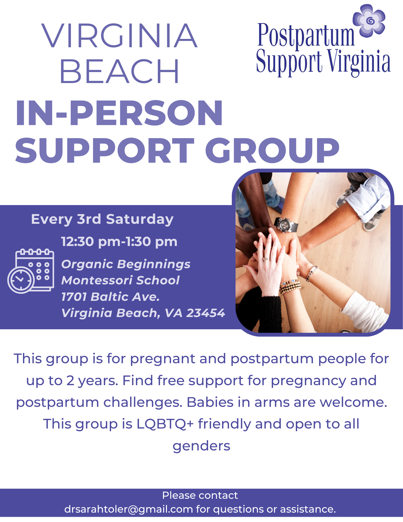 Virginia Beach Support Group is for pregnant and postpartum people up to 2 years. Find free support for pregnancy and postpartum challenges. Babies in arms welcome. This group is LGBTQ+ friendly and open to all genders.